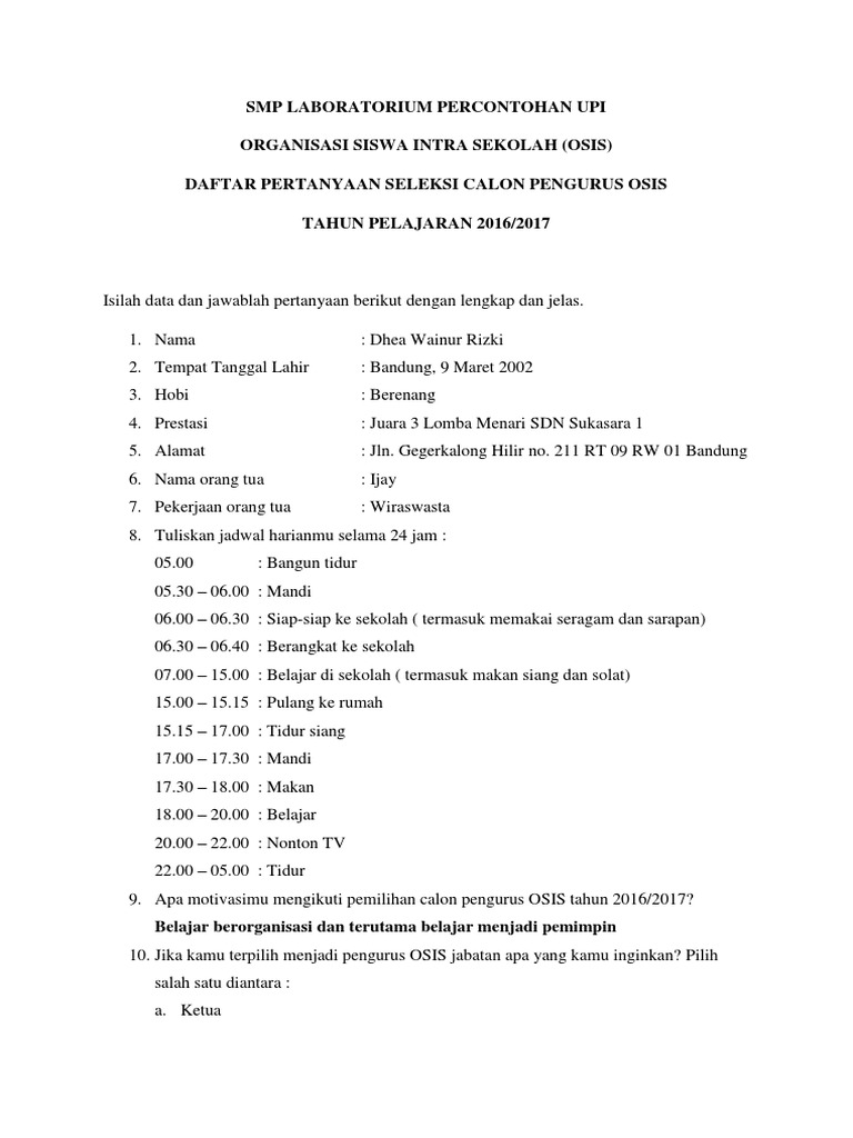 Biodata Calon Pengurus Osis Smp Labschool Dea Wainur Rizki - Apa niat anda menjadi anggota pengurus osis?